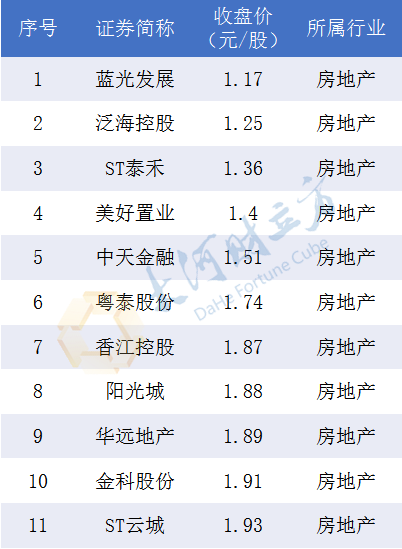 股价介于1元与2元之间的60只股票中,地产股占了将近五分之一,包括ST泰禾(1.36元/股)、阳光城(1.88元/股)、金科股份(1.91元/股)、美好置业(1.4元/股)等11只个股。
