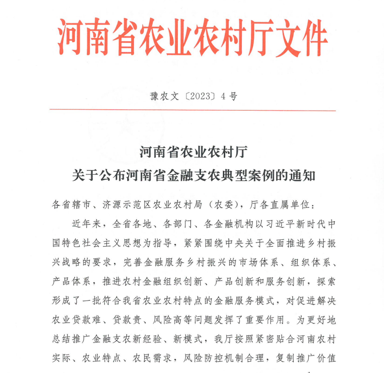 【大河财立方 记者 吴海舒】1月12日,大河财立方记者获悉,河南省农业农村厅发布了《关于公布河南省金融支农典型案例的通知》(以下简称《通知》)。《通知》指出,近年来,全省各地、各部门、各金融机构紧紧围绕中央关于全面推进乡村振兴战略的要求,完善金融服务乡村振兴的市场体系、组织体系、产品体系,推进农村金融组织创新、产品创新和服务创新,探索形成了一批符合我省农业农村特点的金融服务模式,对促进解决农业贷款难、贷款贵、风险高等问题发挥了重要作用。