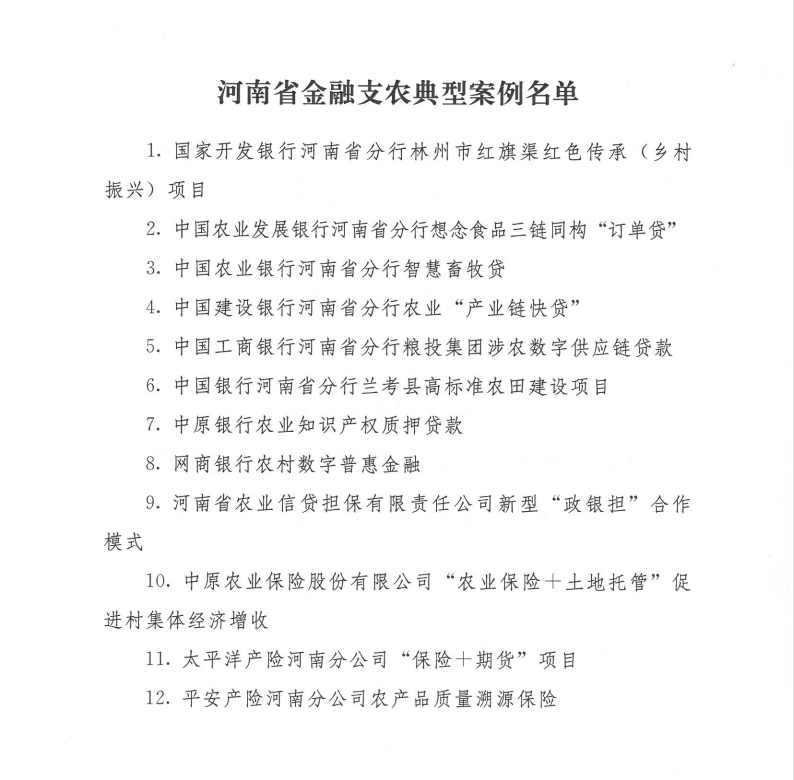 为更好地总结推广金融支农新经验、新模式,河南省农业农村厅按照紧密贴合河南农村实际、农业特点、农民需求,风险防控机制合理,复制推广价值较高等标准,择优评选了12个金融支农优秀典型案例。