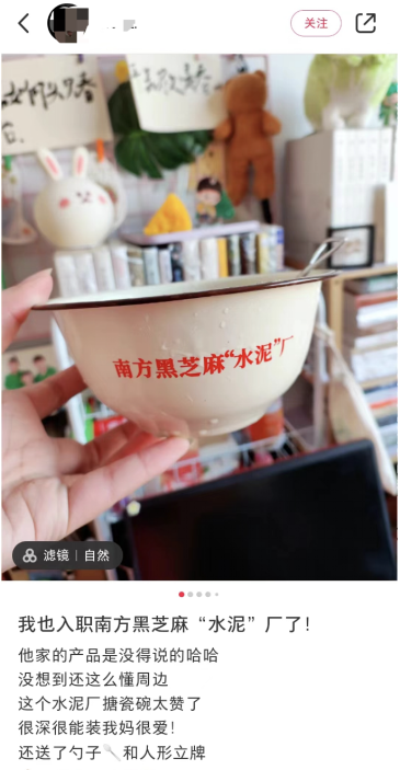 南方黑芝麻糊则在去年11月推出“打工人套餐”,一上市就成为“爆品”。2022年双11期间,以周边搪瓷碗带动的水泥糊套装,在小红书等平台上卖到断货。有小红书网友晒出评价:“入职南方黑芝麻‘水泥厂’,一起抬着饭碗做厂友吧。”