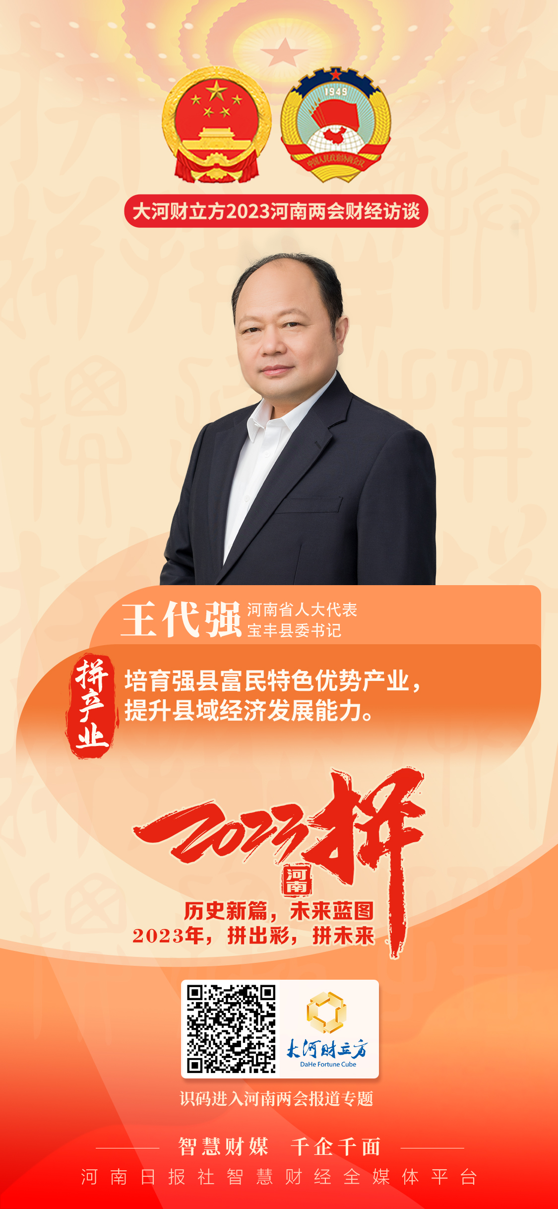 2023年河南省两会期间,大河财立方记者采访了河南省人大代表、宝丰县委书记王代强,听他讲述县域经济高质量发展的故事。