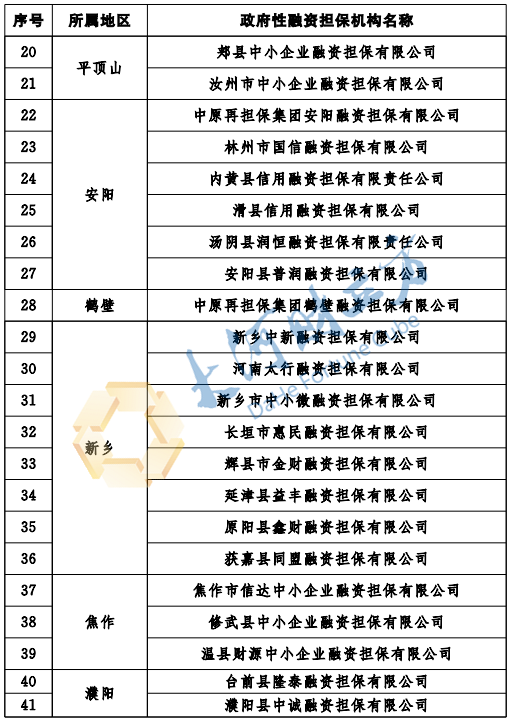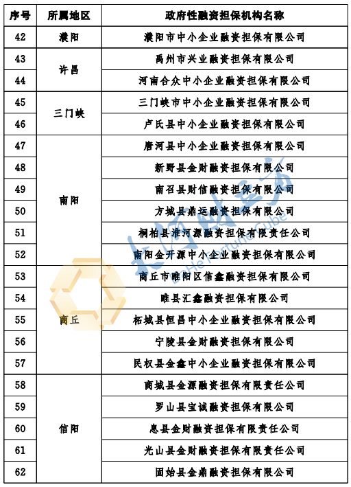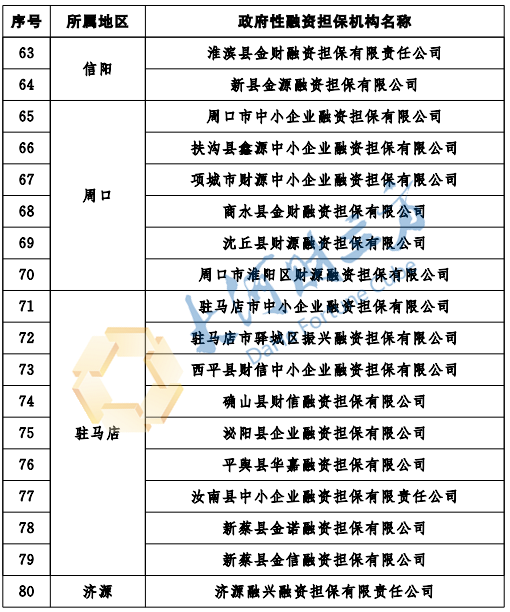 从名单来看,驻马店市政府性融资担保机构最多,共有9家入选,其次为新乡市共有8家入选。