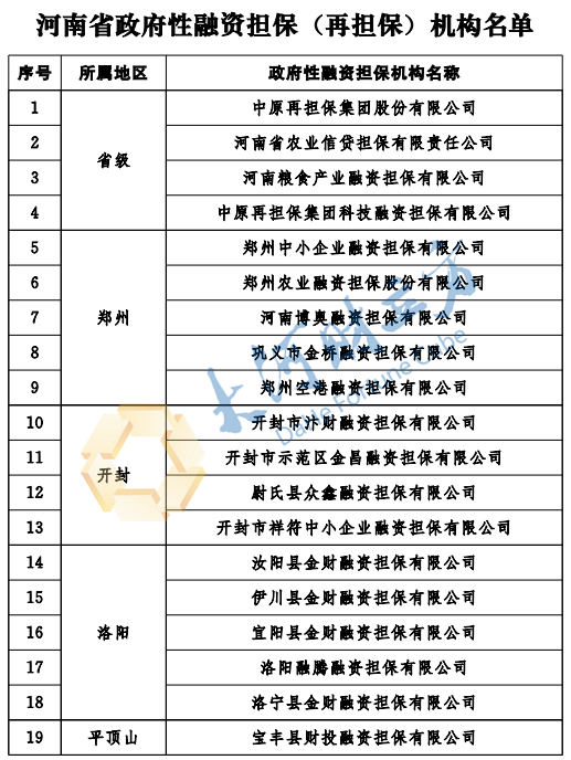 【大河财立方 记者 裴熔熔 陈玉尧】1月19日,大河财立方记者获悉,河南省财政厅、省地方金融监管局联合发布通知,对河南省政府性融资担保 (再担保) 机构名单调整更新。本次调整更新后,河南省政府性融资担保 (再担保) 机构共80家。