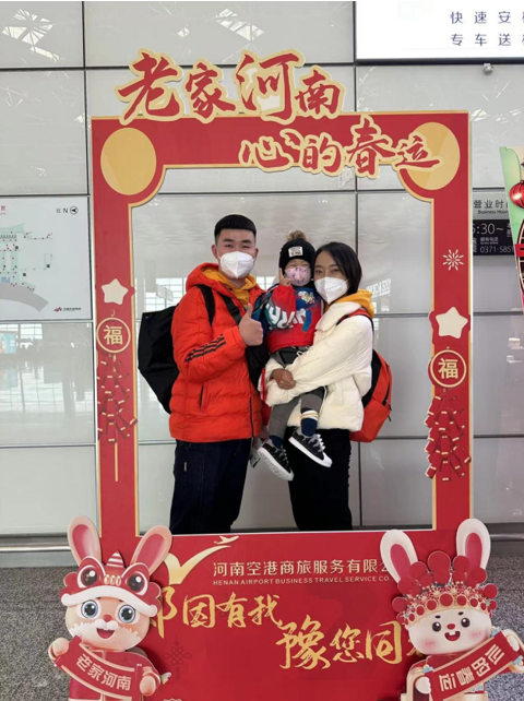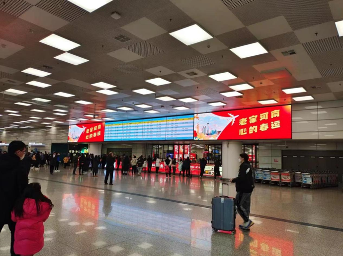 郑州机场春运办工作人员介绍说,郑州机场围绕“老家河南·心的春运”这一主题,对T2航站楼进行了节日装扮,绿植景观也穿上了“新衣”,30余块电子屏播放“欢度春节”“老家河南·心的春运”新春标语,航站楼抢眼的“中国红”让“年”味变得更加浓烈。在出发大厅和国内到达大厅还设置了打卡地——“知道您会来 所以我们一直在”,安检人员还会向旅客送上祝福卡片和拍照道具。