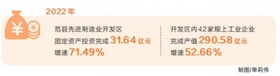 一张年终“成绩单”提气鼓劲:截至2022年年底,范县先进制造业开发区固定资产投资完成31.64亿元、增速71.49%,其中主导产业投资27.23亿元、增速88.07%;主导产业增加值58.12亿元、增速16.5%,战略性新兴产业增加值3.67亿元、增速7.1%;开发区内42家规上工业企业完成产值290.58亿元、增速52.66%,营业收入313.14亿元、增速73%。
