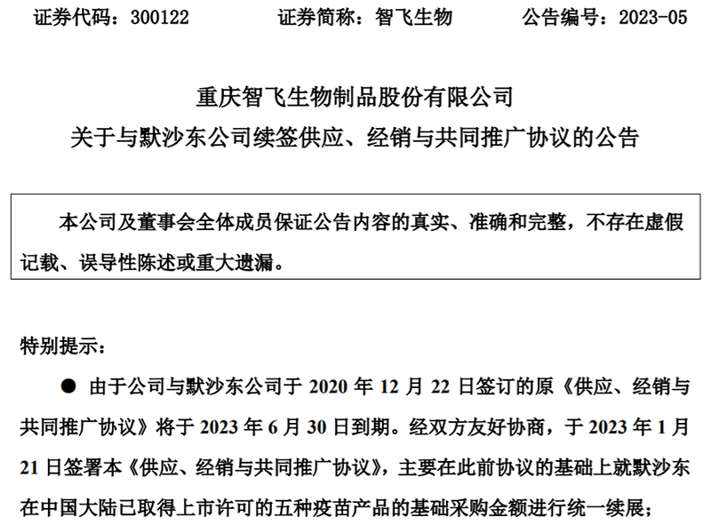 根据公告,智飞生物宣布与默沙东签订5种疫苗产品的续约协议。