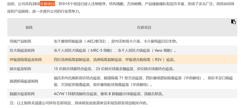 除了已上市且拥有超50%市场份额的ACYW135群脑膜炎球菌多糖疫苗和A群C群脑膜炎球菌多糖结合疫苗,以及2020年批签发数量爆发的Hib结合疫苗,智飞生物在2022年半年报中披露,在研项目共28项,其中15个项目已进入注册程序,覆盖预防结核病、肺炎、脑膜炎、流感、狂犬病等传染病的人用疫苗、生物制品项目。