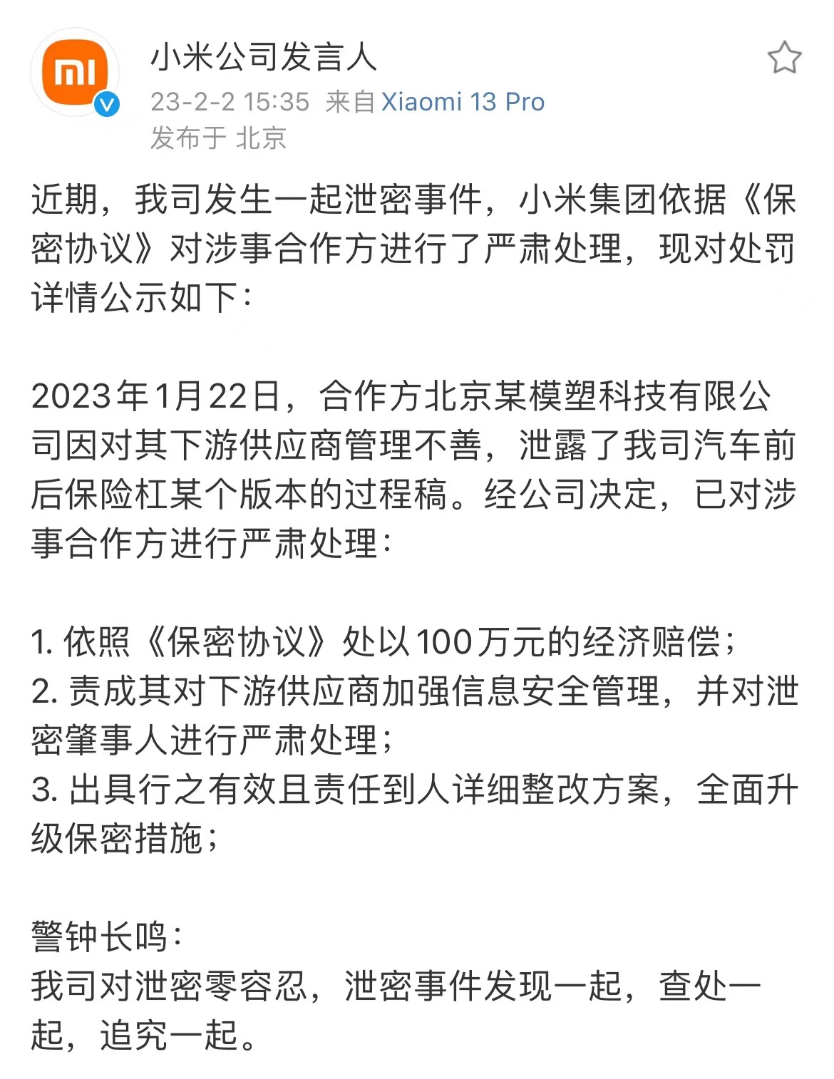对于涉事合作方,小米将依照《保密协议》处以100万元的经济赔偿,责成其对下游供应商加强信息安全管理,并对泄密人进行处理。同时要求该公司出具行之有效且责任到人详细整改方案,全面升级保密措施。