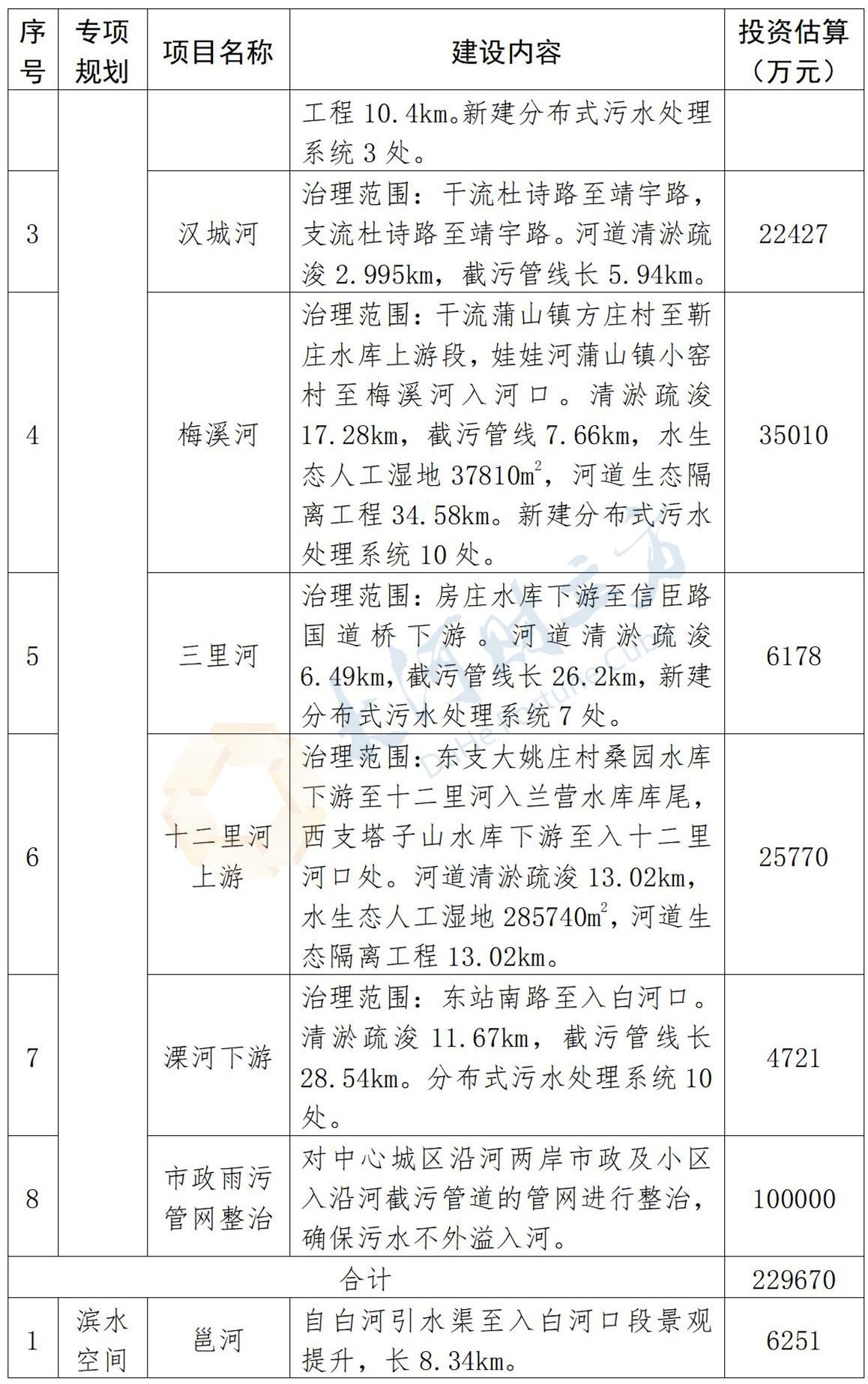 邕河、温凉河、汉城河、梅溪河、三里河、十二里河、溧河上游未治理段治理完成,实施中心城区沿河雨污水排放口整治、雨污水管网缺陷整治及重点区域雨污水管网分流制改造。