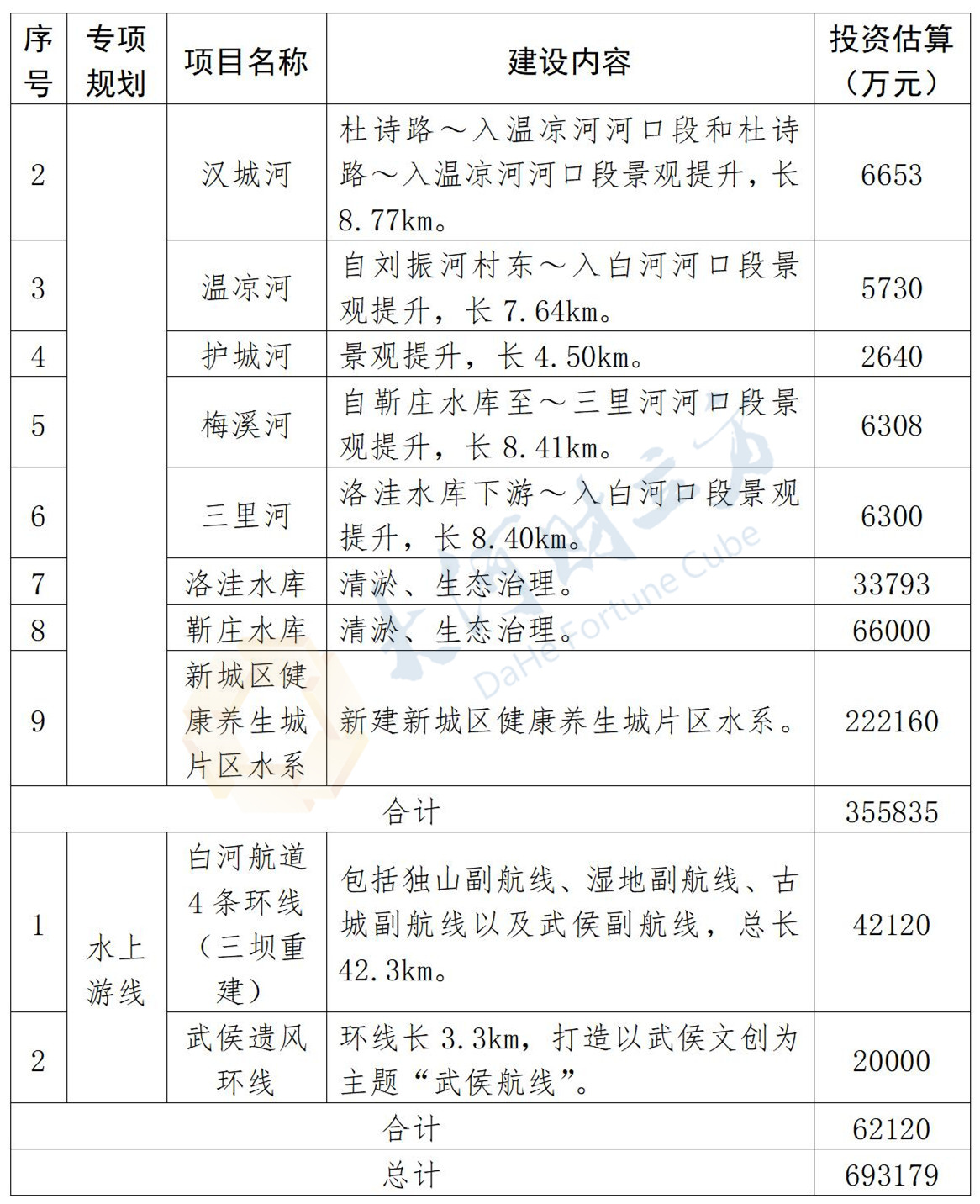 白河右岸邕河、温凉河、汉城河、梅溪河、三里河、护城河6条河道景观提升工程完成,左岸重点实施北部健康养生城片区水系建设。