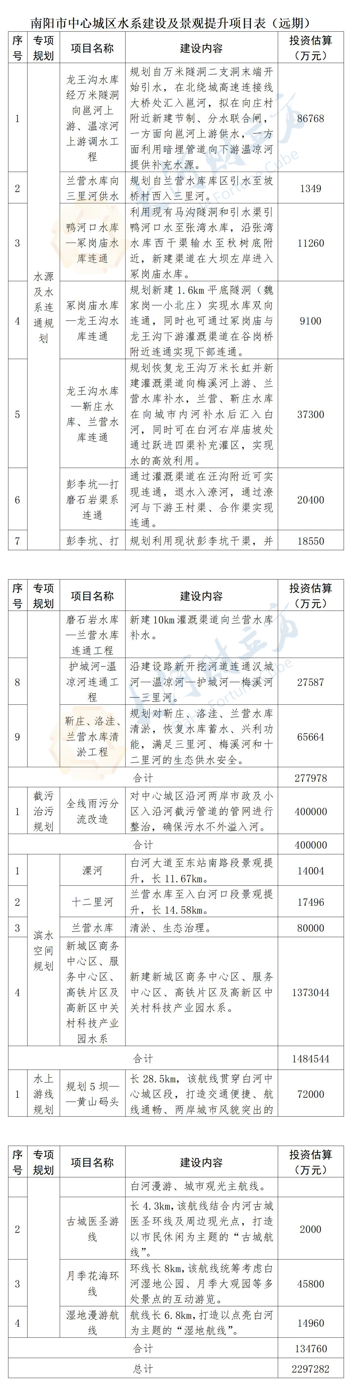 远期,全面实施水源及水系连通工程建设,完成中心城区各级市政道路、小区雨污水管网分流制改造,白河及内河游船通航工程全面完成,十二里河、溧河景观提升及新城区水系工程全面建成,水绿网络形成纵横系统,实现“水通、水清、水大、景美”的规划目标。