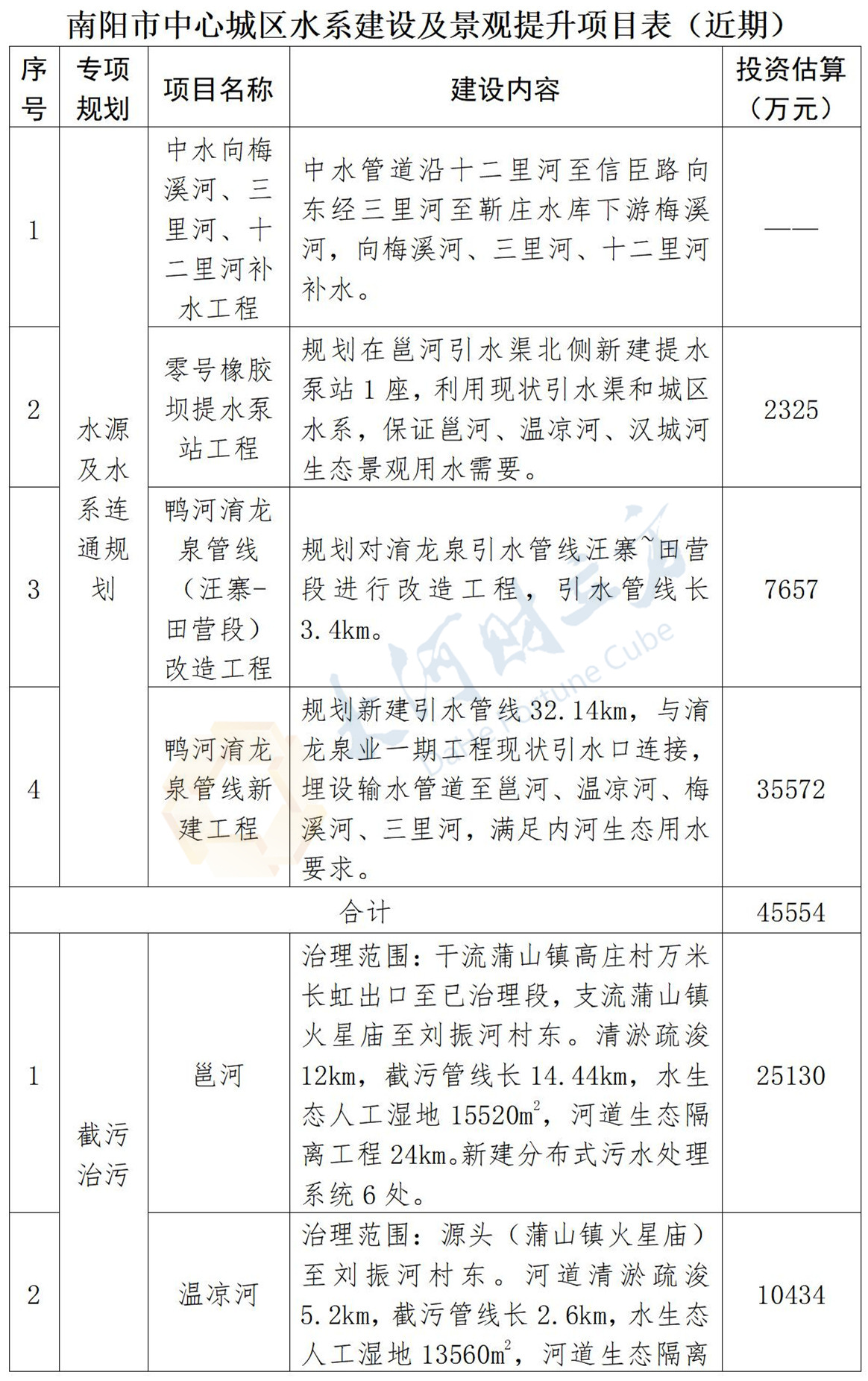 1.中水向梅溪河、三里河、十二里河补水工程:利用中水管道沿十二里河至信臣路向东经三里河至靳庄水库下游梅溪河,向梅溪河、三里河、十二里河补水。