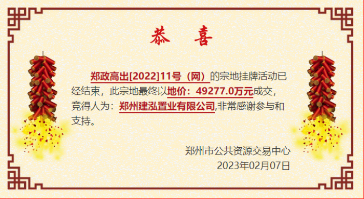 【大河财立方 记者 徐兵 杨萨】2月7日,郑州市新年首轮集中供地正式开拍。郑州市公共资源交易中心显示,郑政高出[2022]11号(网)的宗地最终以起始价49277万元由郑州建泓置业有限公司竞得。