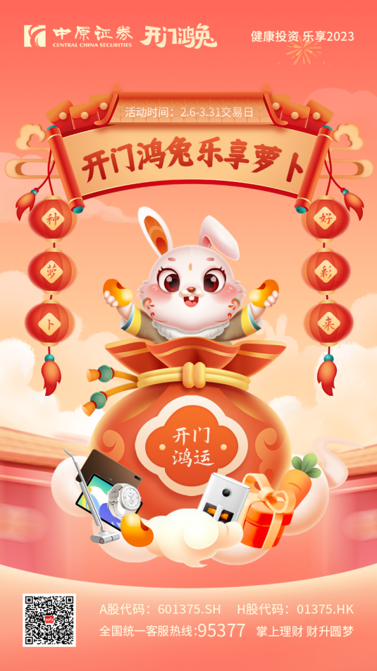 【大河财立方 记者 张克瑶】兔年伊始,万象更新。中原证券财升宝App品牌活动上新!近日,大河财立方记者登录财升宝App发现,“开门鸿兔”活动已上首页,用户点击“参与”进入活动页面即可参与,完成相应任务,就有机会抽取华为智享大礼包、米家拖地机等好礼,还可领取Level-2体验券。