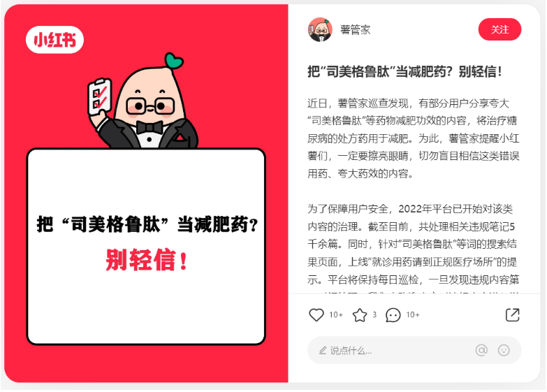 2月11日,小红书发布治理公告称,从2022年开始就对分享夸大“司美格鲁肽”等药物减肥功效的内容进行治理,截至目前已经处理违规笔记5000多条,同时在用户搜索该药时主动进行安全提示。