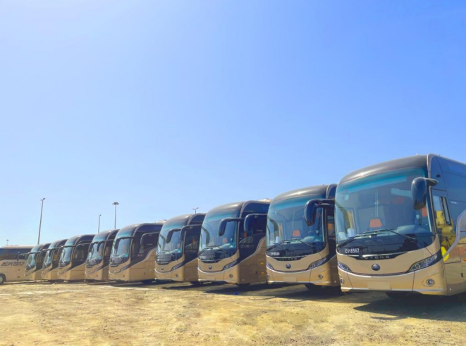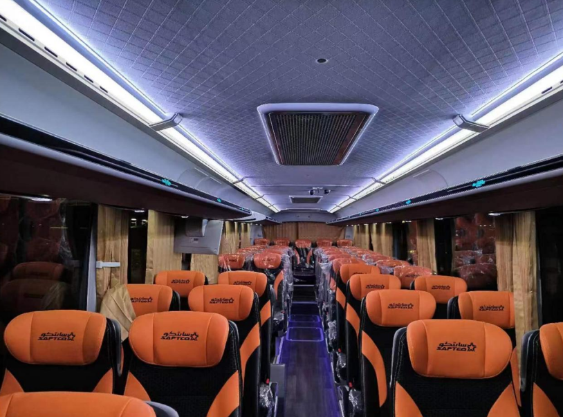 众所周知,沙特干旱、高温,对进口车辆的安全性和空调性能等要求较高,针对当地炎热干燥的气候和车辆运营里程长,强度大等需求,宇通研发团队深入当地进行调查研究,对该批车型进行了高度定制化的调整和改进。在动力系统上,宇通创新性地使用AMT变速箱,匹配大马力发动机改善长途驾驶的行驶质感;同时为了给车辆带来更多的承载空间,提升单程载客能力,宇通将600L油箱布置在前轮前方区域,从而为车身留出充足的行李舱空间,满足当地居民长途乘坐携带行李的需求。此外,车辆还搭载了宇通独有的二代热管理技术,有效提高了整车的舒适性和运营经济性,车内则统一配备了42000KCAL空调,制冷速度及制冷效果表现优异,为司乘人员带来了清凉舒适的乘坐体验。此外,该批车还有10台专用于皇室Royal Family服务的用车,采用了宇通定制商务座椅YTH07,大顶菱形格栅内饰。