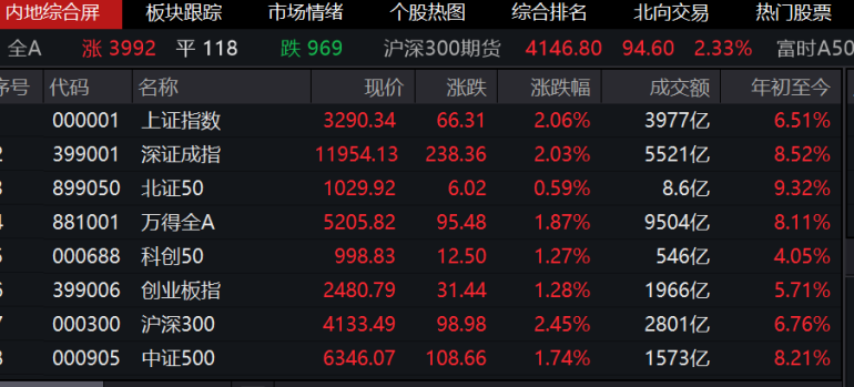 Wind数据显示,截至2月20日收盘,A股上涨股票达到3992只,上证指数、深证成指涨幅均超过2%,申万一级行业指数全线飘红,建筑材料、家用电器、非银金融、通信、传媒计算机等板块涨幅超3%,其中建筑材料板块涨幅超4%,多只千亿巨头冲击涨停。