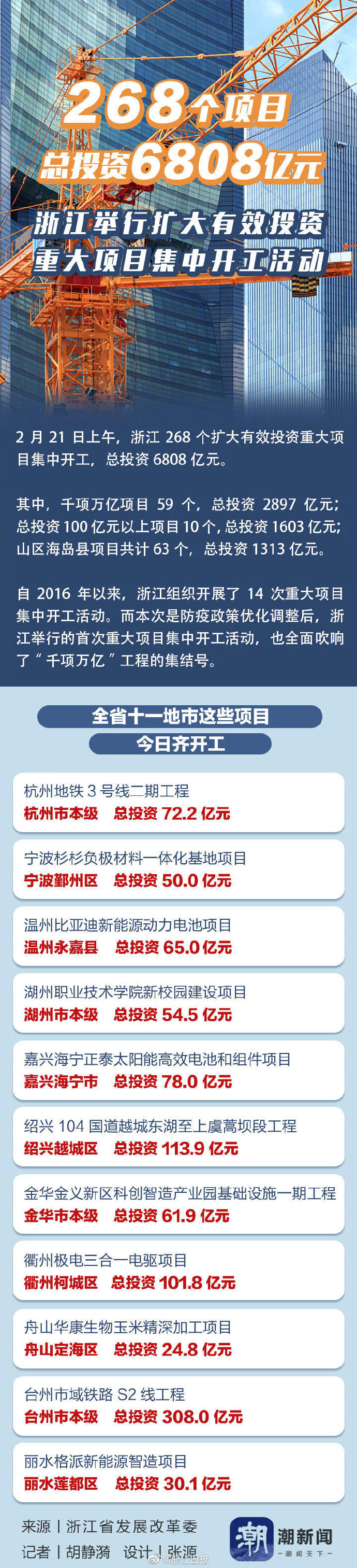 2月21日上午,全省扩大有效投资重大项目集中开工活动在杭州举行。参加本次集中开工仪式的项目共268个,总投资6808亿元,平均总投资25亿元,年度投资1390亿元,年度投资占比20.4%。其中千项万亿项目59个,总投资2897亿元,年度投资516亿元。总投资100亿元以上项目10个,总投资1603亿元,占24%。山区海岛县项目共计63个,总投资1313亿元,年度计划投资309亿元,山区海岛县全覆盖。