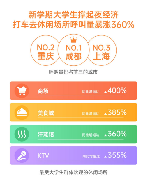 哪些公共娱乐场所最受大学生群体欢迎呢?据T3出行数据,前往商场、美食城、汗蒸馆、KTV的订单呼叫量排名前四,同比增幅分别达400%、385%、360%和355%。
