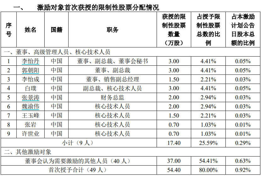 根据公告,建龙微纳此次激励对象包括董事、副总裁、董事会秘书李怡丹,董事、副总裁郭朝阳,董事、销售副总经理李怡成,副总裁、核心技术人员白璞,财务总监张景涛和其他4名核心技术人员,以及其他董事会认为需要激励的对象40人。