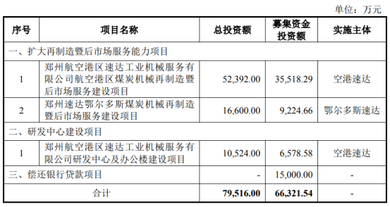据招股书,本次IPO,速达股份拟发行不超过1900万股新股,募集资金6.63亿元,用于扩大再制造暨后市场服务能力项目、研发中心建设项目及偿还银行贷款项目。