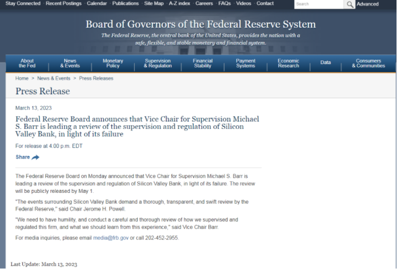 据美联储官网,美联储将调查其对硅谷银行的监管,并于5月1日发布调查结果;美联储主席鲍威尔表示,需要围绕硅谷银行这一事件展开迅速、深入的调查;美联储副主席巴尔将领导此次调查。