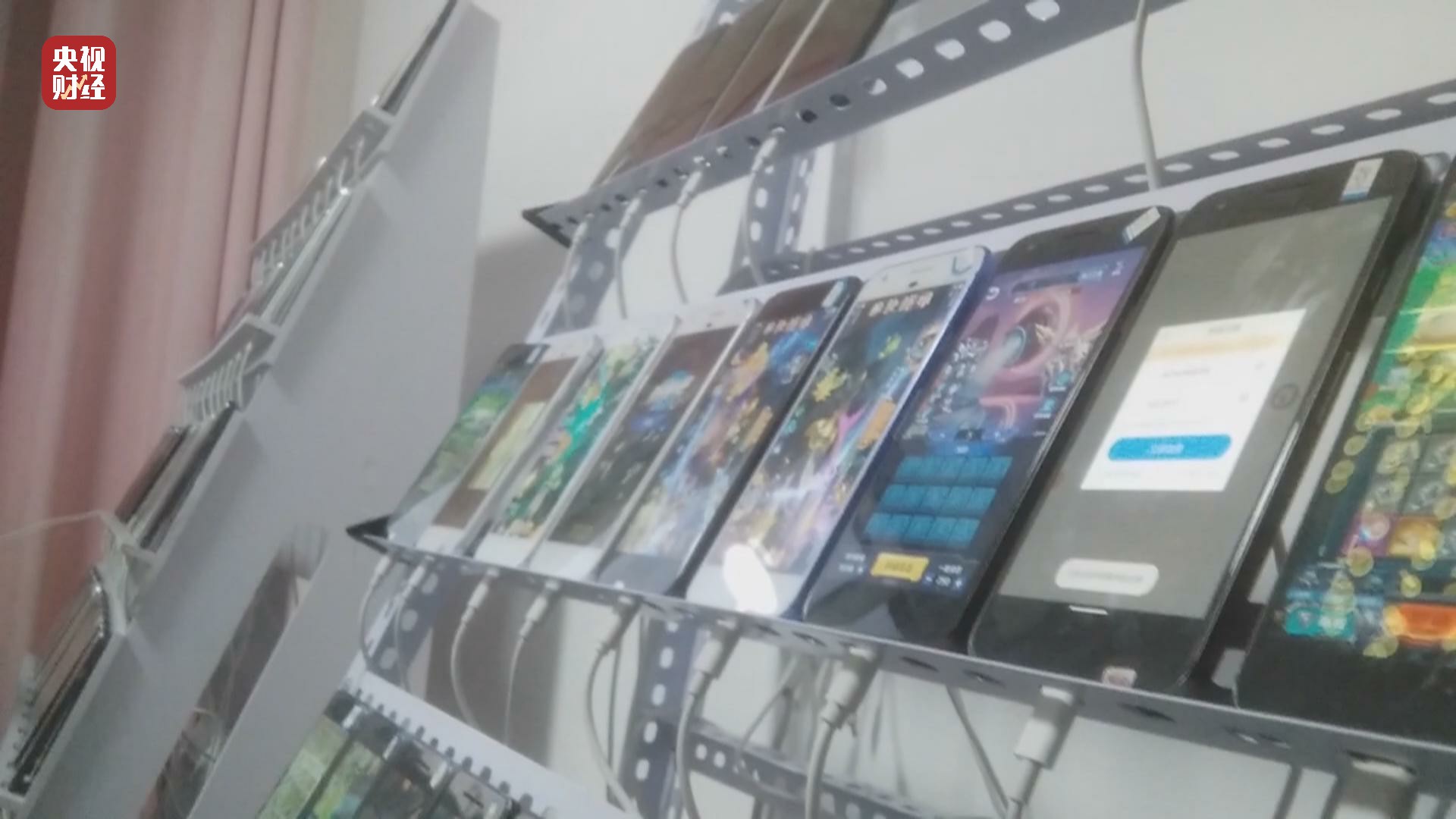 在该公司一个数十平方米的房间,架子上也同样摆满了手机,大约有四五百台,屏幕显示多款游戏正在如火如荼地进行着,有糖果果联盟、贝贝捕鱼、玩棋盘、斗地主等等。