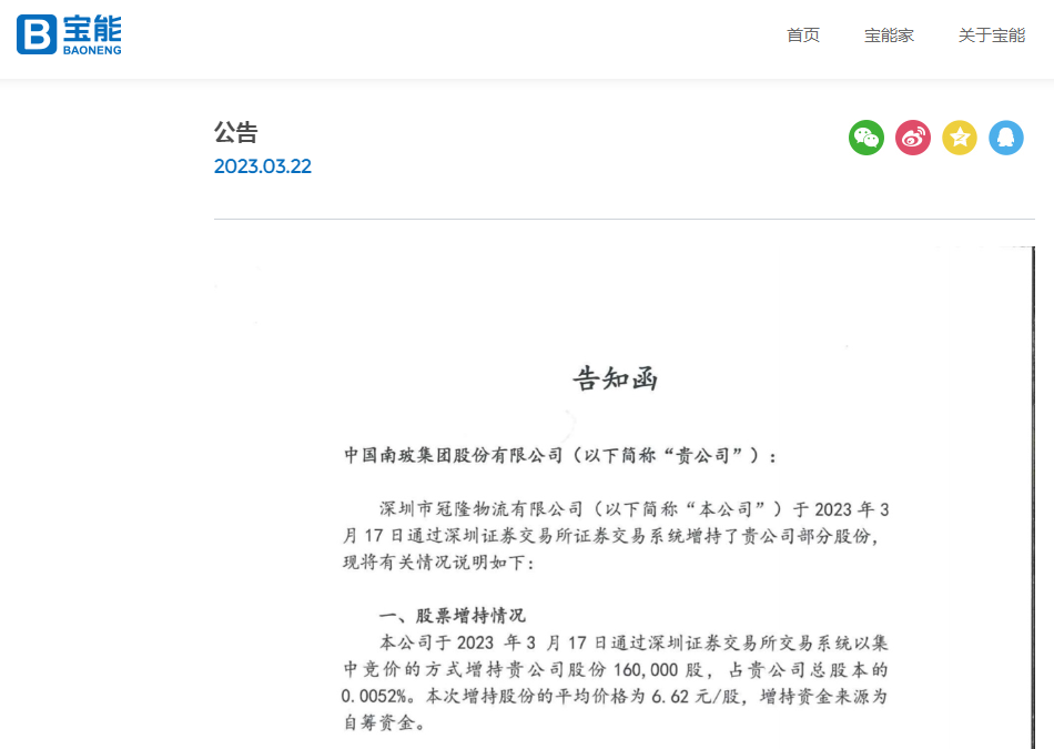 宝能集团今天(3月22日)上午突然在官网发布一则公告,内容是深圳市冠隆物流有限公司(下称“冠隆物流”)对南玻A的《告知函》。