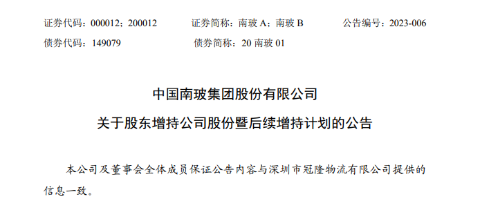 晚间8点左右,南玻A对这则《告知函》进行了正式的公告。南玻称,公司3月19日13:53收到冠隆物流发来的《告知函》,根据相关规则审查后发现增持计划缺少增持数量或金额的下限等核心要素,于2023年3月20日19:45向冠隆物流发出《询问函》,要求确认及补充增持主体前6个月的减持情况、拟增持股份的数量或金额等信息,3月21日17:42收到了冠隆物流补充及更新后的《告知函》。