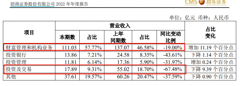从财富管理和机构业务、投资银行、投资管理、投资及交易四大业务板块来看,收入下降的大头还是在传统的财管和机构(经纪业务)以及投资及交易(自营),尤其是自营收入降幅达到67%,财管和机构收入减少18亿、自营收入减少37亿。