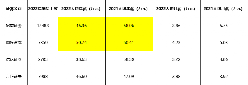 根据测算,招商证券1.2万多员工,2022年人均薪酬为46.36万元,较2021年的68.96万元,下降约23万元。