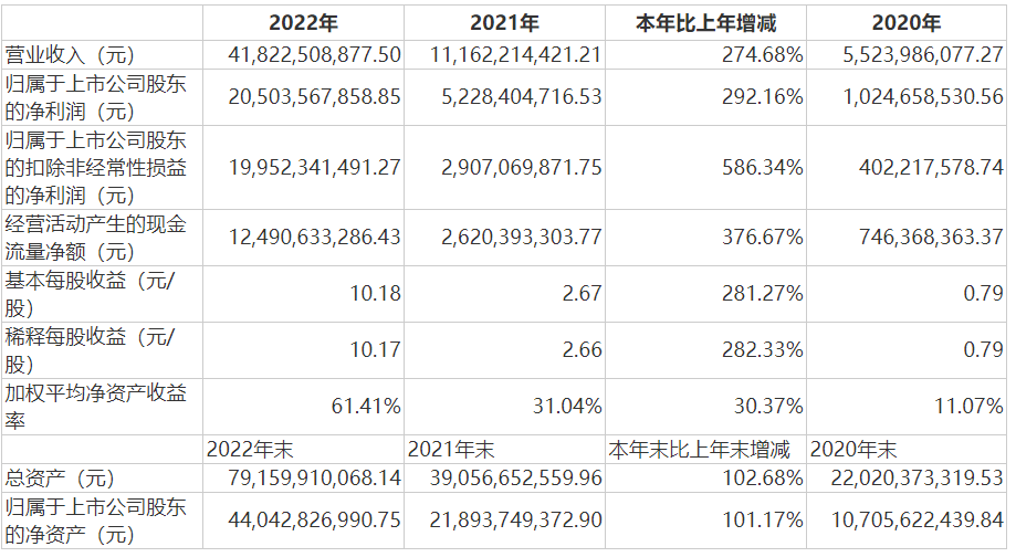2022年,赣锋锂业实现营业收入418.23亿元,同比增长274.68%;归母净利润205.04亿元,同比增长292.16%;扣非净利润199.52亿元,同比增长586.34%;基本每股收益10.18元。拟每10股派发现金红利10元(含税)。