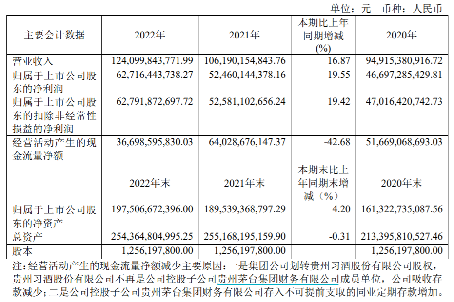 【大河财立方消息】3月30日,贵州茅台发布2022年年度报告。公司2022年实现营业收入1241亿元,同比增长16.87%;净利润627.16亿元,同比增长19.55%;基本每股收益49.93元。