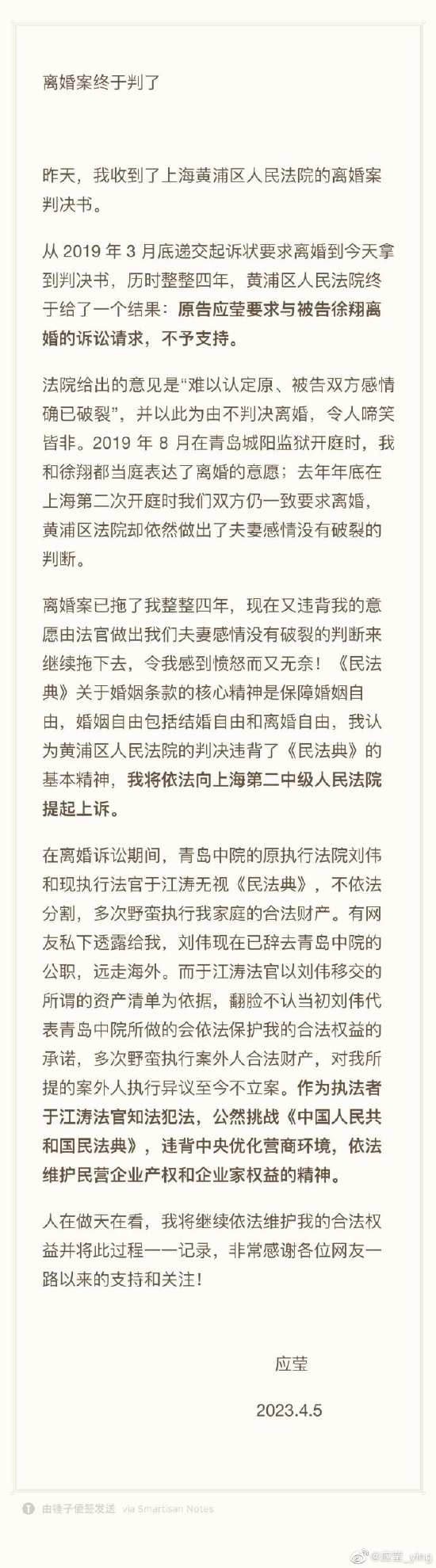 “离婚案终于判了。昨天,我收到了上海黄浦区人民法院的离婚案判决书。从2019年3月底递交起诉状要求离婚到今天拿到判决书,历时整整四年,黄浦区人民法院终于给了一个结果:原告应莹要求与被告徐翔离婚的诉讼请求,不予支持。”