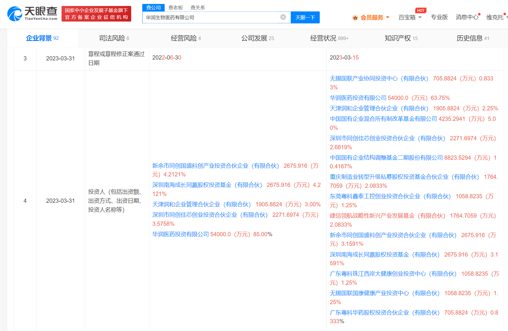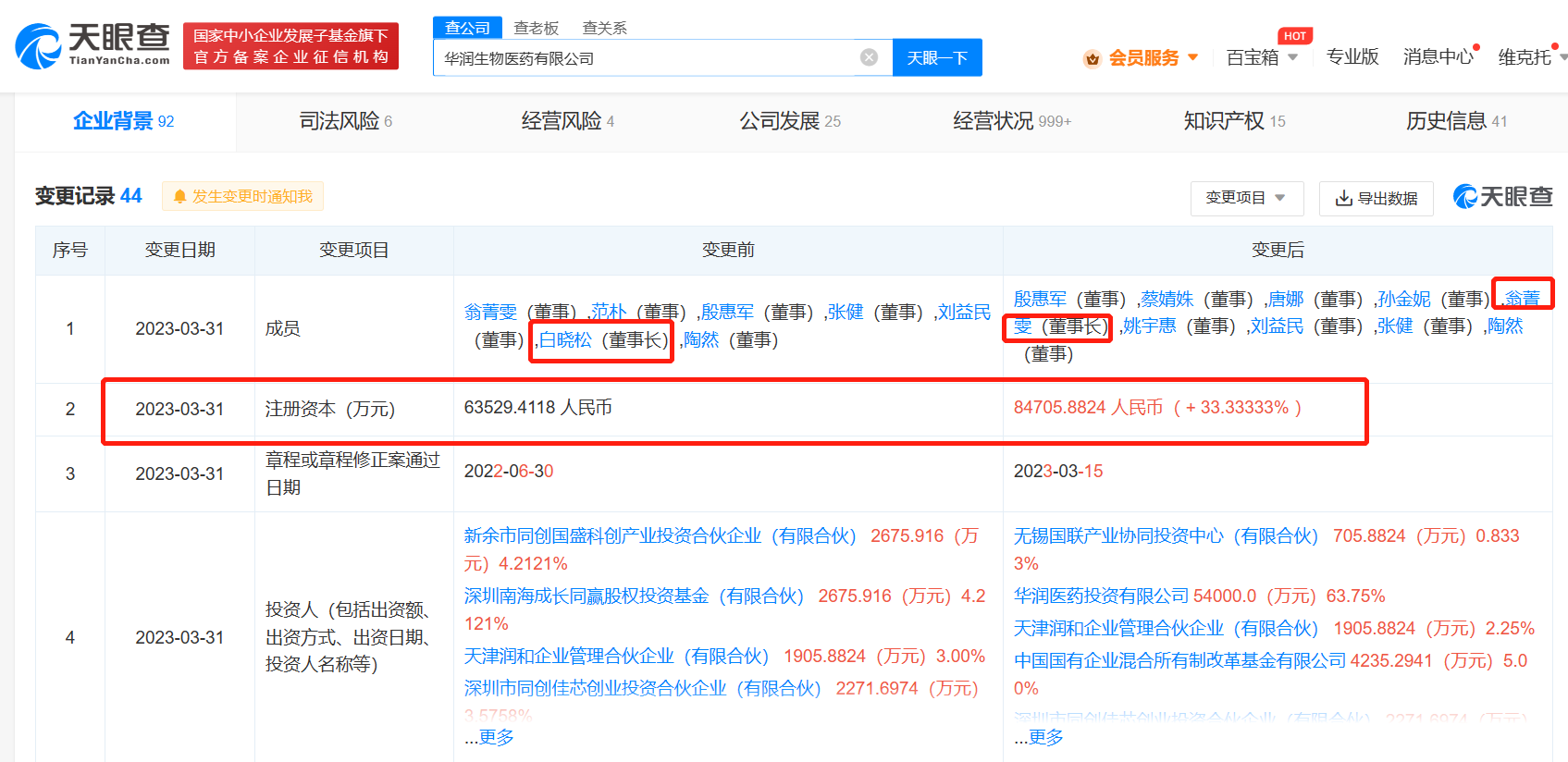 【大河财立方消息】天眼查App显示,近日,华润生物医药有限公司发生工商变更,股东新增中国国有企业混合所有制改革基金有限公司、中国国有企业结构调整基金二期股份有限公司、建信领航战略性新兴产业发展基金(有限合伙)等;白晓松卸任董事长,由翁菁雯接任;注册资本由约6.35亿人民币增至约8.47亿元,增幅超33.3%。