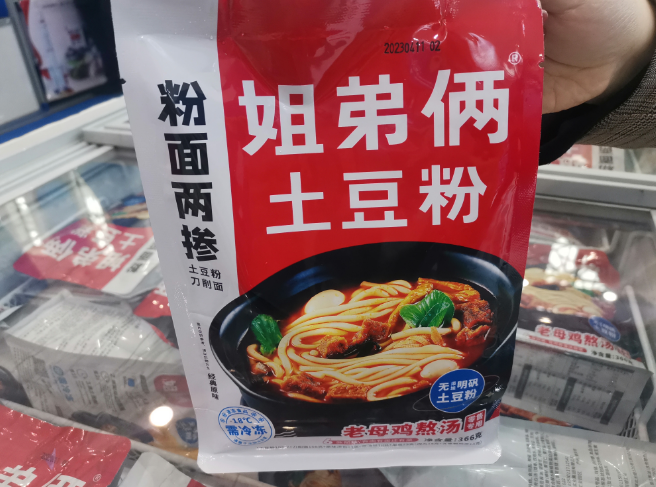记者随手从姐弟俩展位台拿起一包预包装土豆粉,注意到产品的生产日期是2023年4月11日。展位负责人、姐弟俩市场部负责人王晨告诉记者,这几天展位的预包装土豆粉销量不错,展柜里现有的预包装土豆粉都是昨晚下单,连夜生产的。“今天上午客流量比前两天更多,展位现在的存货也很紧俏,只有冰箱里的这些,我们上午已经向仓库进行调货了。”