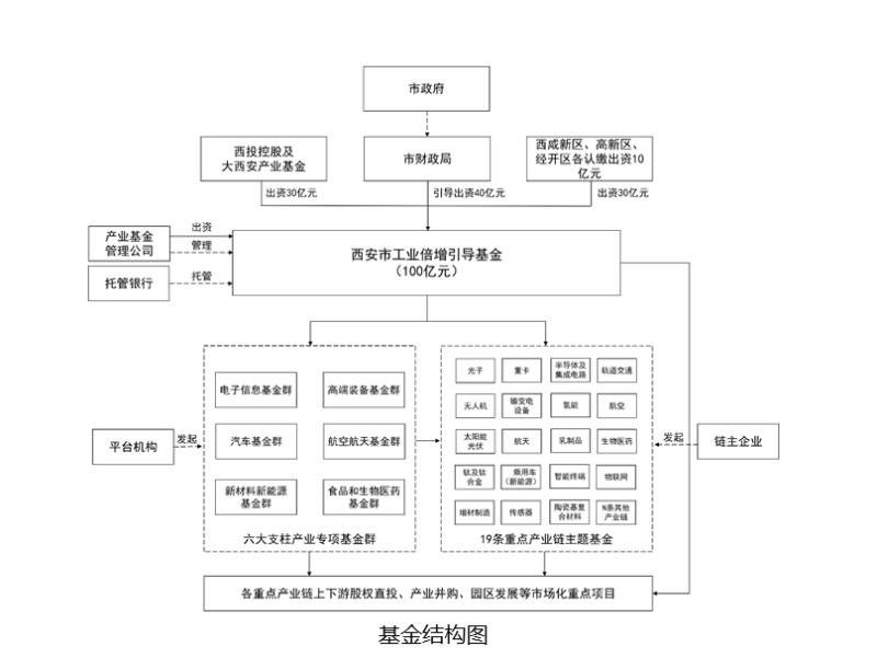引导基金总规模100亿元。其中,市财政通过统筹各类专项资金认缴出资40亿元;西安投资控股有限公司(以下简称西投控股)通过自有资金以及盘活大西安产业基金存量资产等方式认缴出资30亿元;西咸新区、高新区、经开区各认缴出资10亿元。