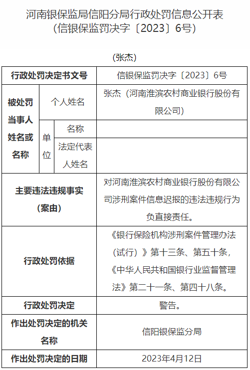 张杰对河南淮滨农村商业银行股份有限公司涉刑案件信息迟报的违法违规行为负直接责任,信阳银保监分局给予其警告处分。