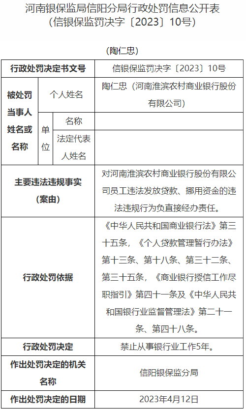 陶仁忠对河南淮滨农村商业银行股份有限公司员工违法发放贷款、挪用资金的违法违规行为负直接经办责任,信阳银保监分局禁止其从事银行业工作5年。