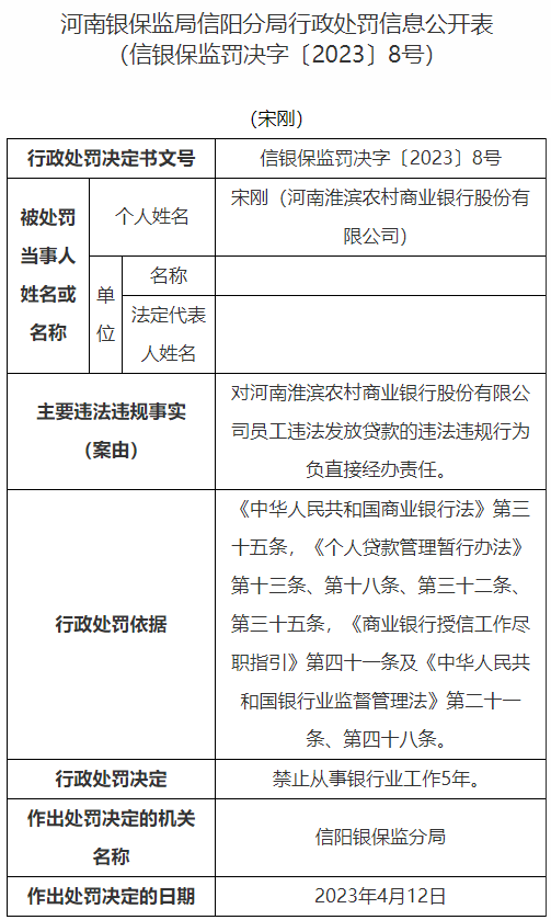 宋刚对河南淮滨农村商业银行股份有限公司员工违法发放贷款的违法违规行为负直接经办责任,信阳银保监分局禁止其从事银行业工作5年。