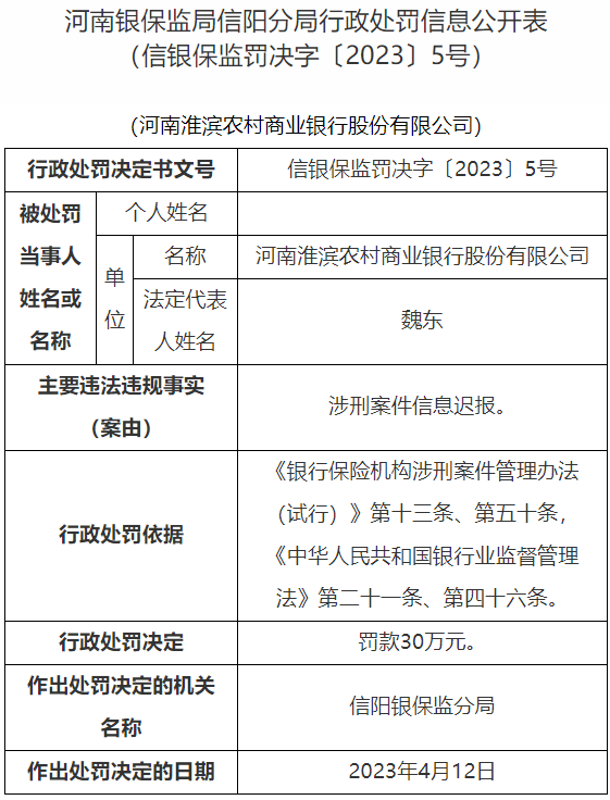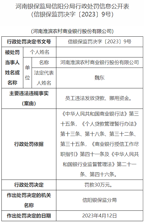 行政处罚表显示,河南淮滨农村商业银行股份有限公司因涉刑案件信息迟报、员工违法发放贷款、挪用资金,信阳银保监分局对其罚款85万元。