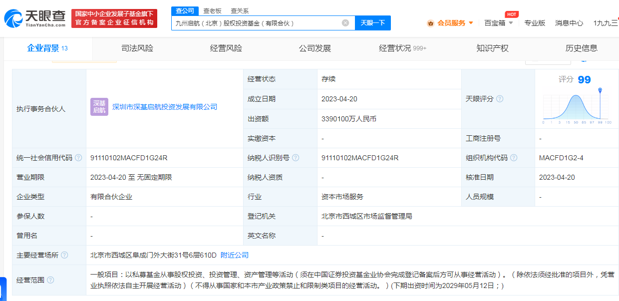 【大河财立方消息】天眼查App显示,近日,九州启航(北京)股权投资基金(有限合伙)成立,执行事务合伙人为深圳市深基启航投资发展有限公司,出资额339.01亿人民币,经营范围含以私募基金从事股权投资、投资管理、资产管理等活动。