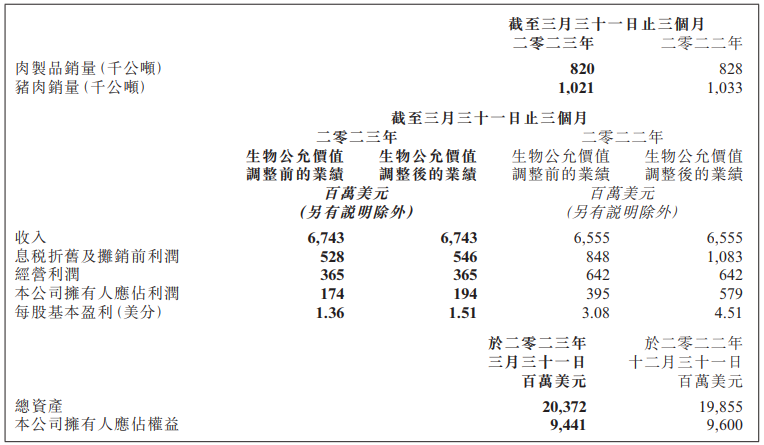 今年前三个月,万洲国际实现营收67.43亿美元(生物公允价值调整前的业绩,下同),归母净利润1.74亿美元。上年同期,营收、净利分别为65.5亿美元、3.95亿美元。