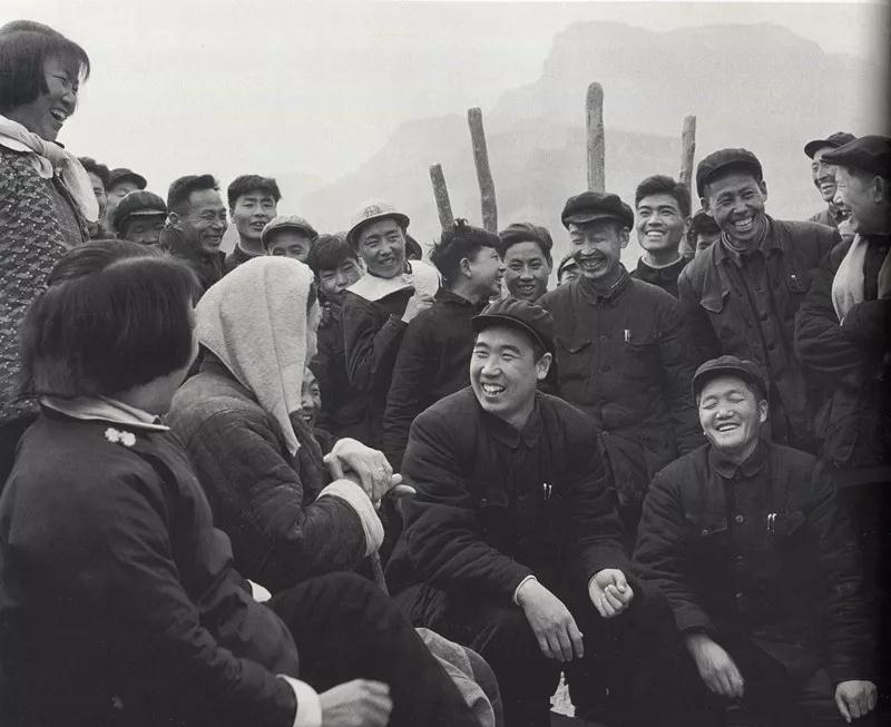 李媛的太爷爷李贵(前排右一)和时任林县县委书记杨贵一起深入群众