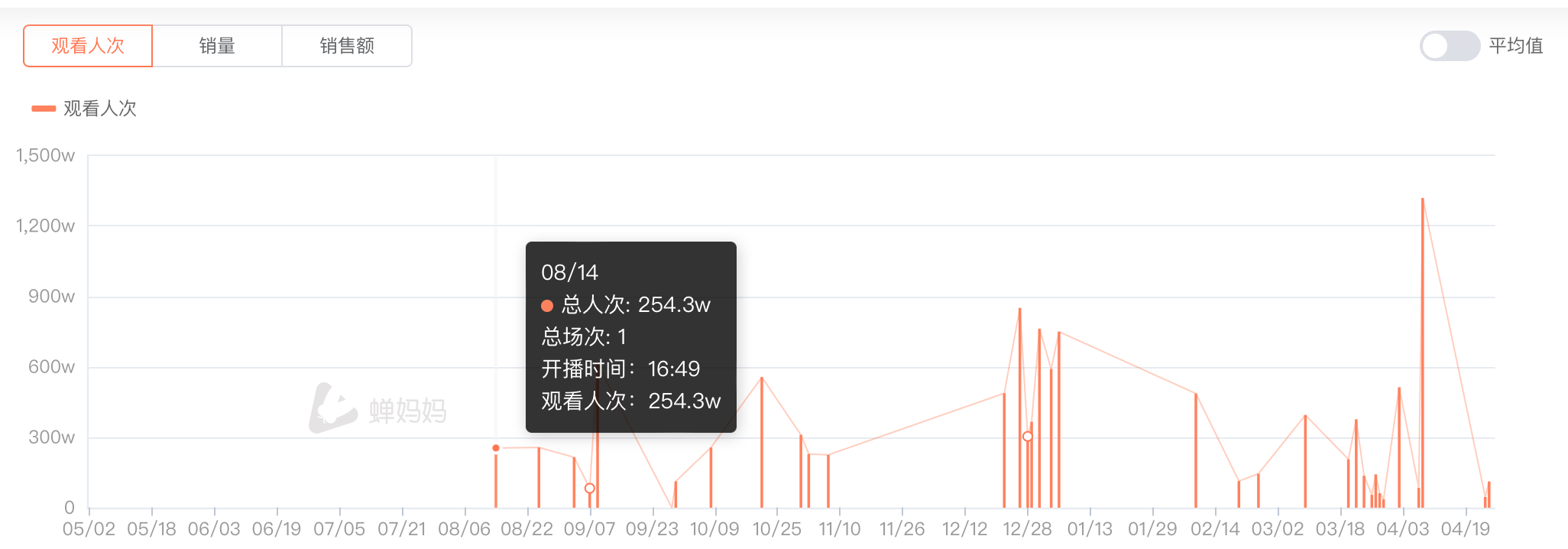 蝉妈妈数据显示,李亚鹏直播间启动于2022年8月14日,当日观看总人次254.3万人。销售额在2023年1月5日达到1000万至2500万的历史高点后持续走低。