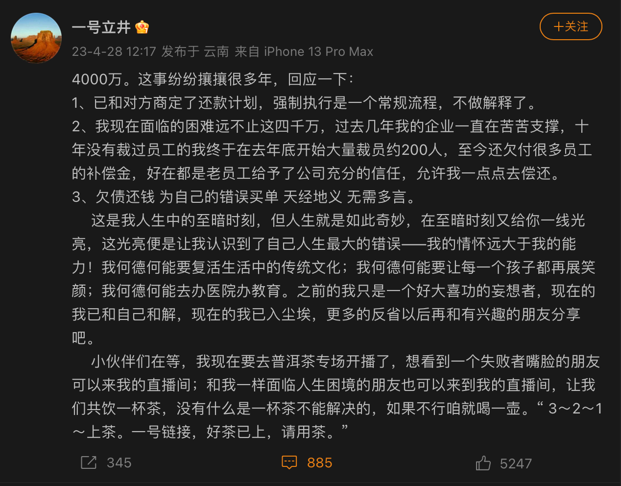 今日,李亚鹏通过微博账号@一号立井回应称:已和对方商定了还款计划,强制执行是一个常规流程,不做解释了;我(李亚鹏)现在面临的困难远不止这四千万,过去几年企业一直在苦苦支撑,十年没有裁过员工,但在去年底开始大量裁员约200人,至今还欠付很多员工的补偿金,好在都是老员工给予了公司充分的信任,允许一点点去偿还;欠债还钱,为自己的错误买单,天经地义,无需多言。