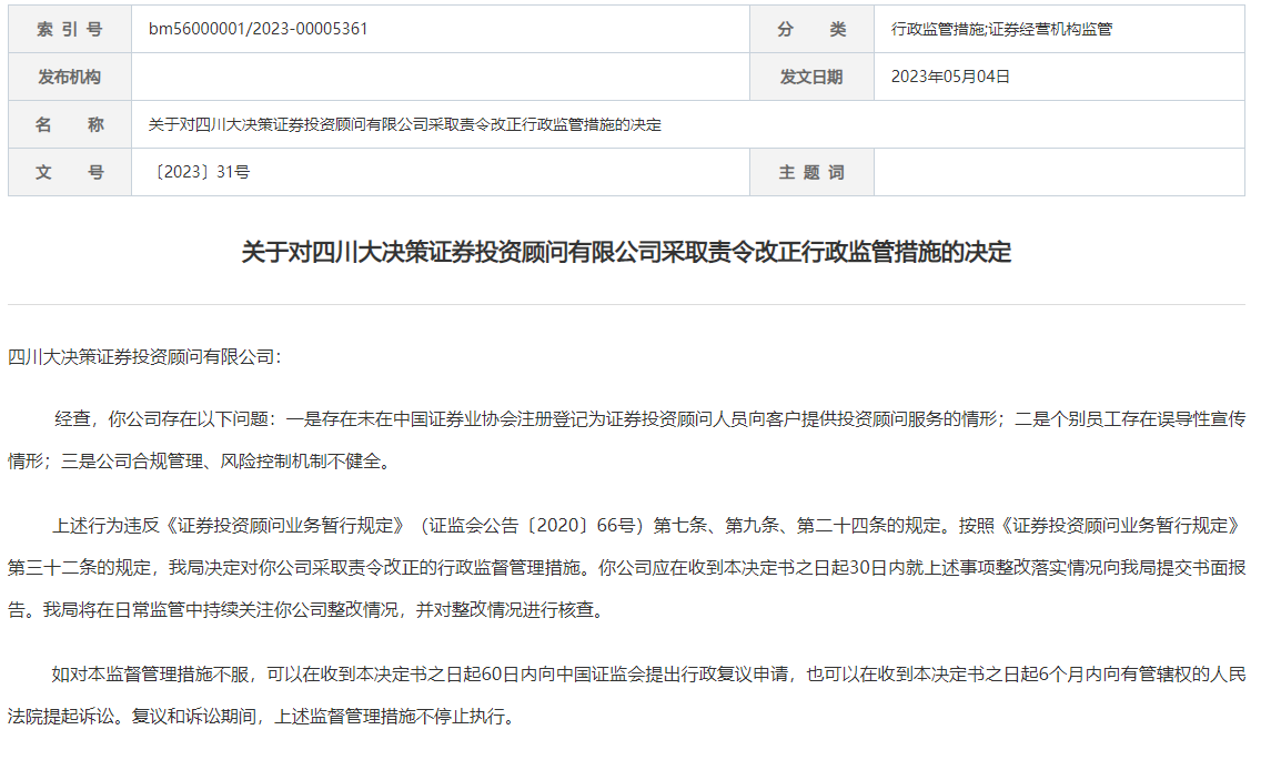 【大河财立方消息】5月4日消息,四川证监局决定对四川大决策证券投资顾问有限公司采取责令改正的行政监督管理措施。