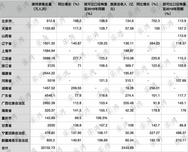 与此同时,已披露接待游客总量数据的13个省市自治区该数据均超2019年同期;已披露旅游总收入的13个省市自治区中有12个该数据超2019年同期。