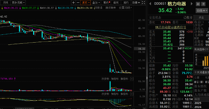 5月4日,截至收盘,格力电器跌9.96%至35.42元/股。