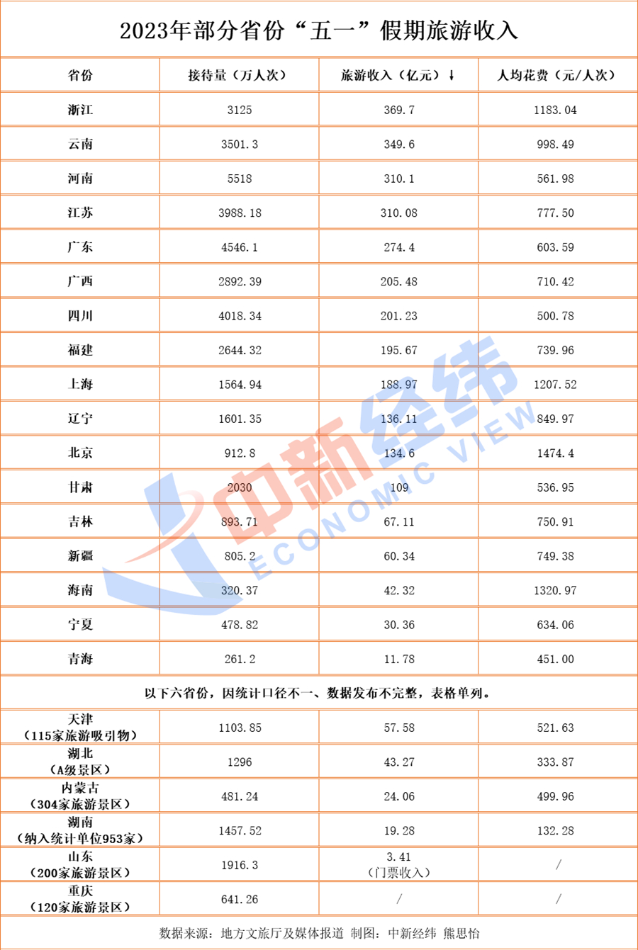 据不完全统计,截至5月4日,23省份公布“五一”旅游成绩单。其中,浙江一马当先,“五一”假期全省累计接待游客3125万人次,实现旅游收入369.7亿元,同比分别增长71%、122.6%,较2019年增长6.5%、3.8%。